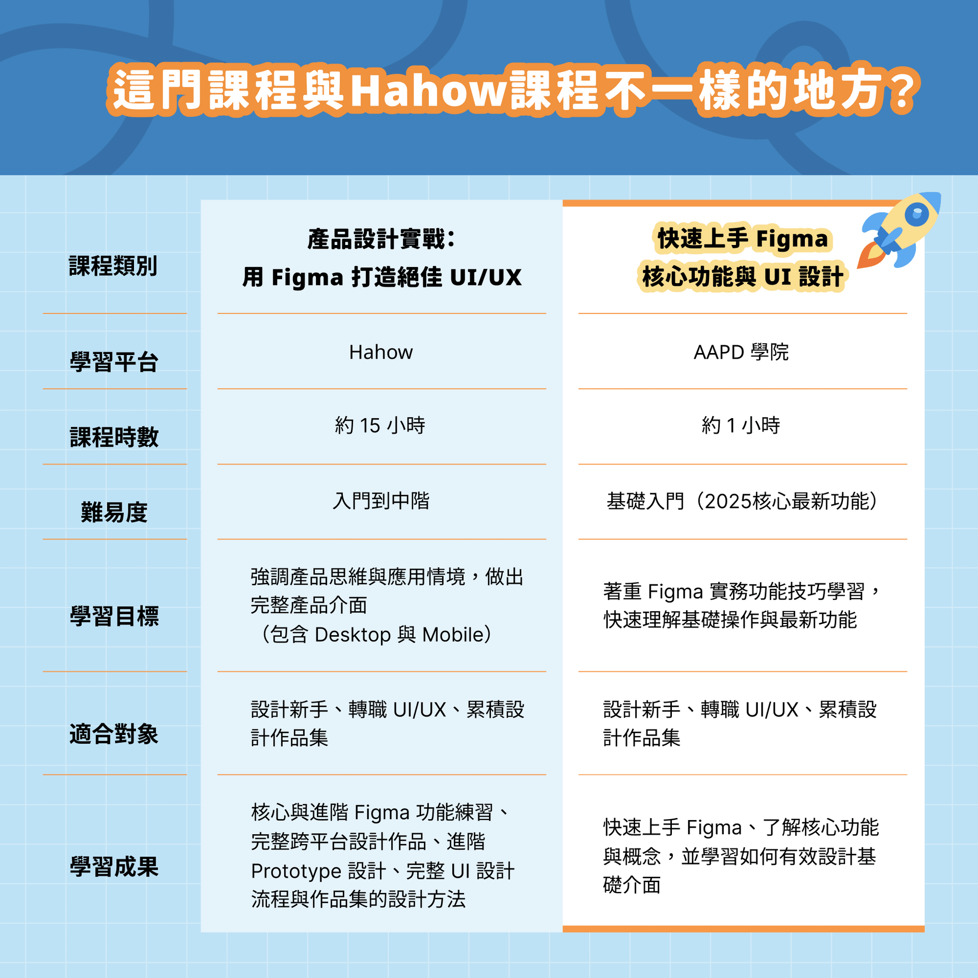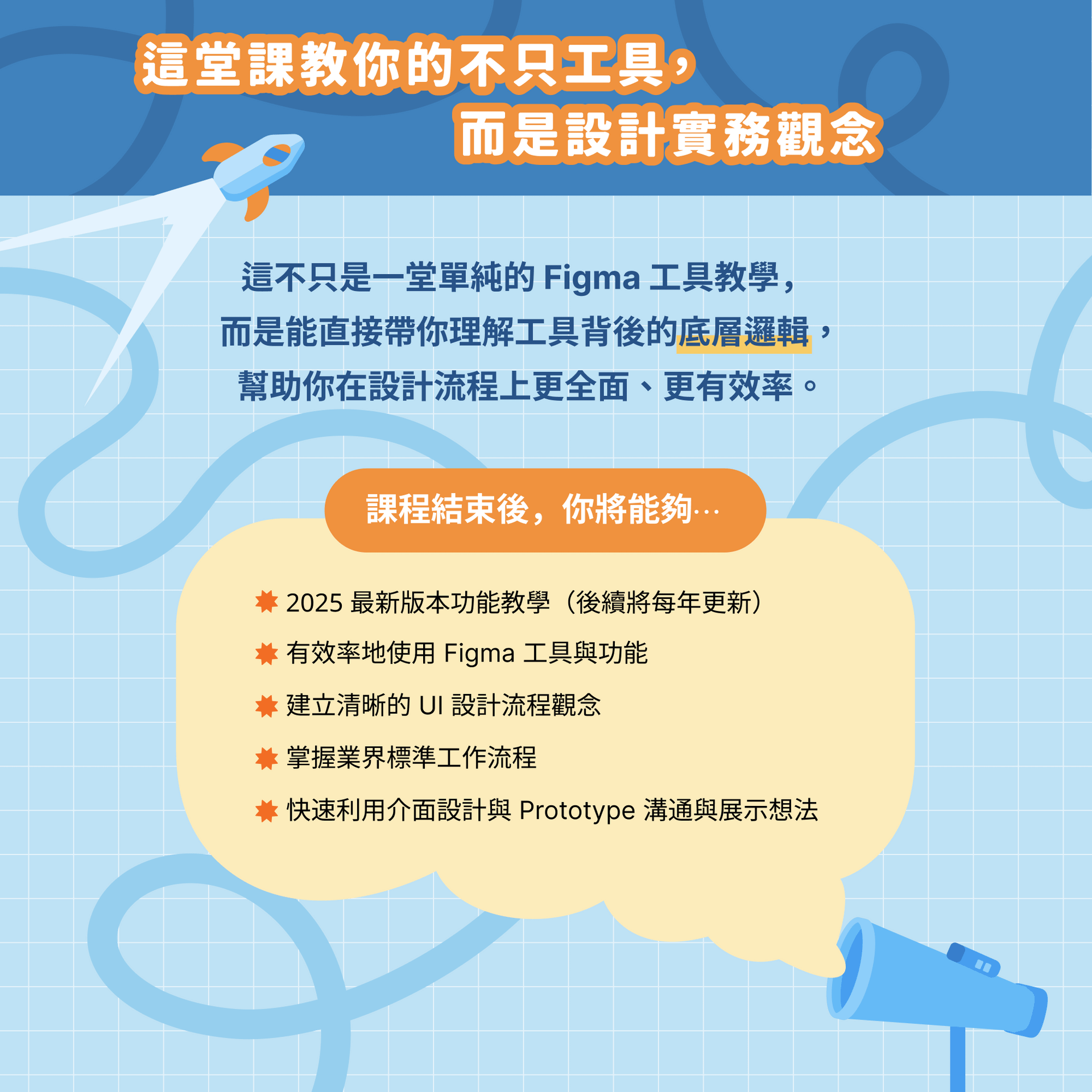 這門課專為想高效學會 Figma 的人打造,只需約 1 小時的時間,就能直接切入實務流程,掌握最實用的基礎技巧與設計觀念,我們建議在課後安排 2–3 小時的實戰練習,讓你在實際操作中鞏固所學,並練習如何將工具技巧與設計思維結合。