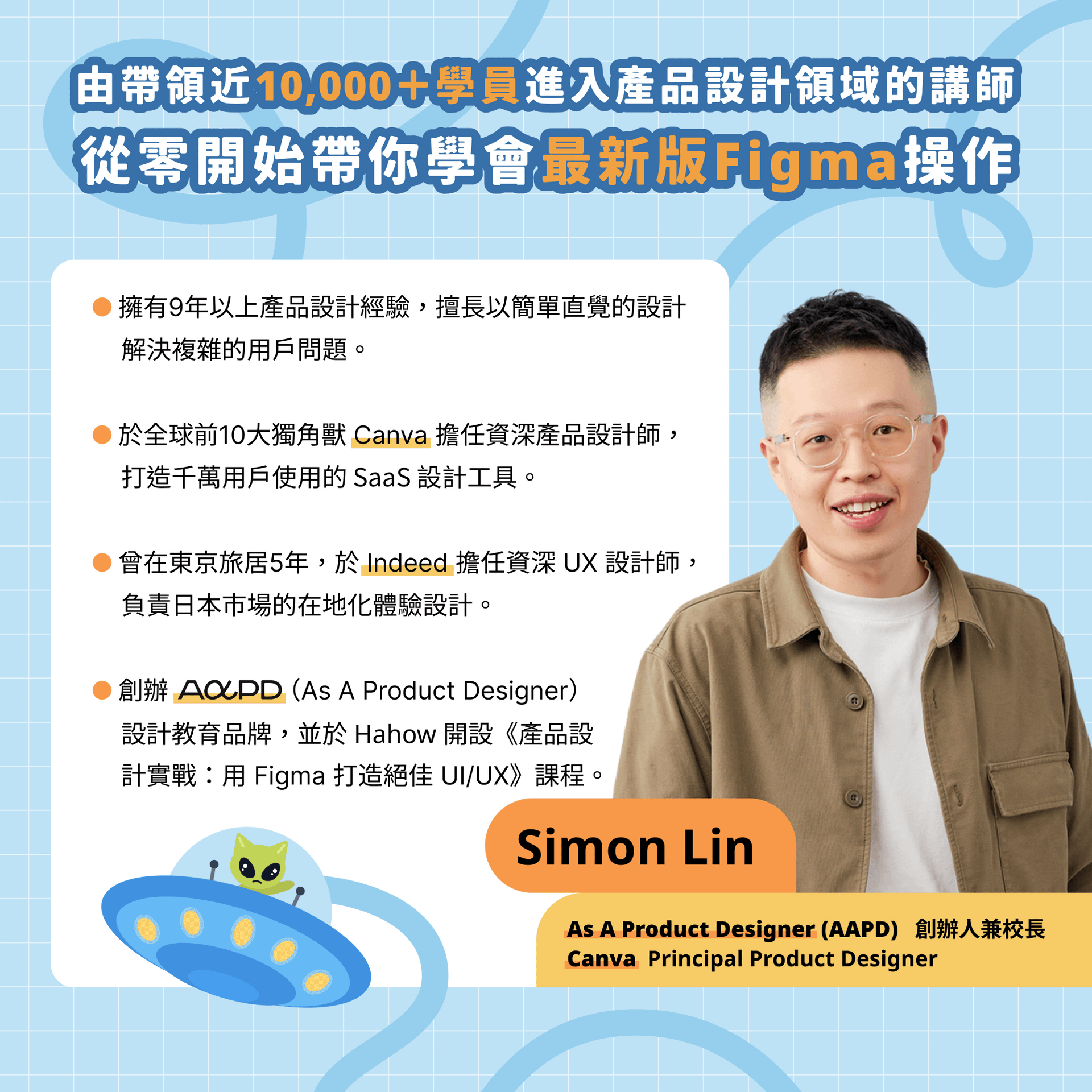擁有超過 9 年的產品設計經驗,擅長透過簡單直覺的設計方案來解決複雜的使用者問題和挑戰。目前居住在澳洲雪梨,在全球前 10 大的獨角獸公司 Canva 擔任資深產品設計師,專注打造全球超過千萬使用者的 SaaS 平面設計工具,幫助更多人體會到設計的美好。曾旅居日本東京 5 年,在全球職缺搜尋引擎 Indeed 擔任資深 UX 設計師,負責日本市場的本地化體驗與服務。同時也是 As A Product Designer (AAPD) 設計教育品牌創辦人,擁有超過近 2 萬的訂閱讀者也與超過 200 名在產品設計領域的作者合作,提供許多實用的學習資源與內容。