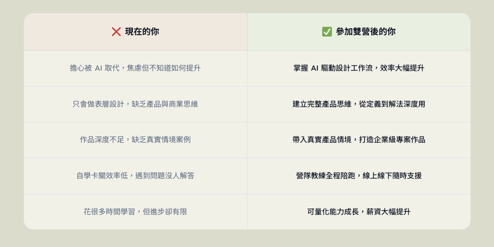 繼續使用傳統方法做設計→效率與品質被 AI 原生設計師超越→產品與商業影響力越來越小→薪資和職涯成長開始停滯→錯過成為 AI 時代稀缺人才的成長機會!