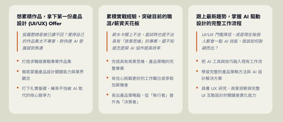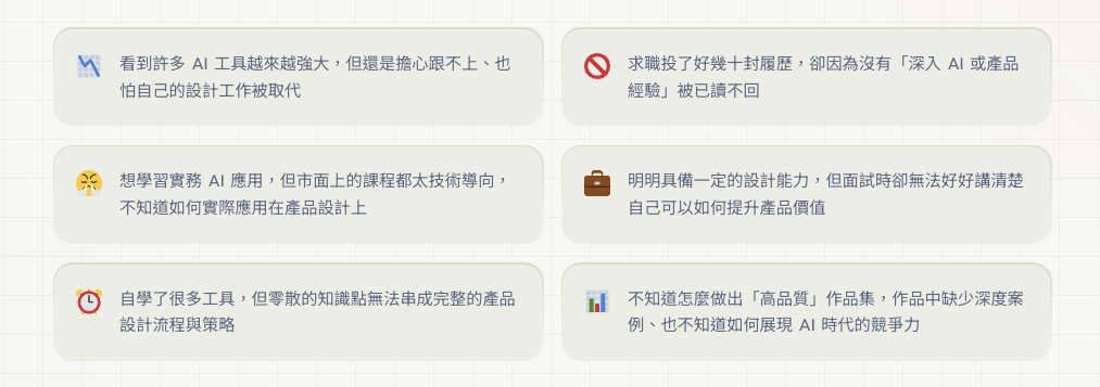不論你是產品(UI/UX)設計師、UX 研究員、產品經理、專案經理、軟體工程師、產品創造者、創業家、獨立開發者、跨領域轉職者等,都能透過這個課程累積出扎實的 AI 與產品實力!