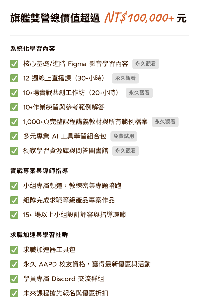 詳細課程內容與課綱,請參考:https://flagship.aapd.com.tw/