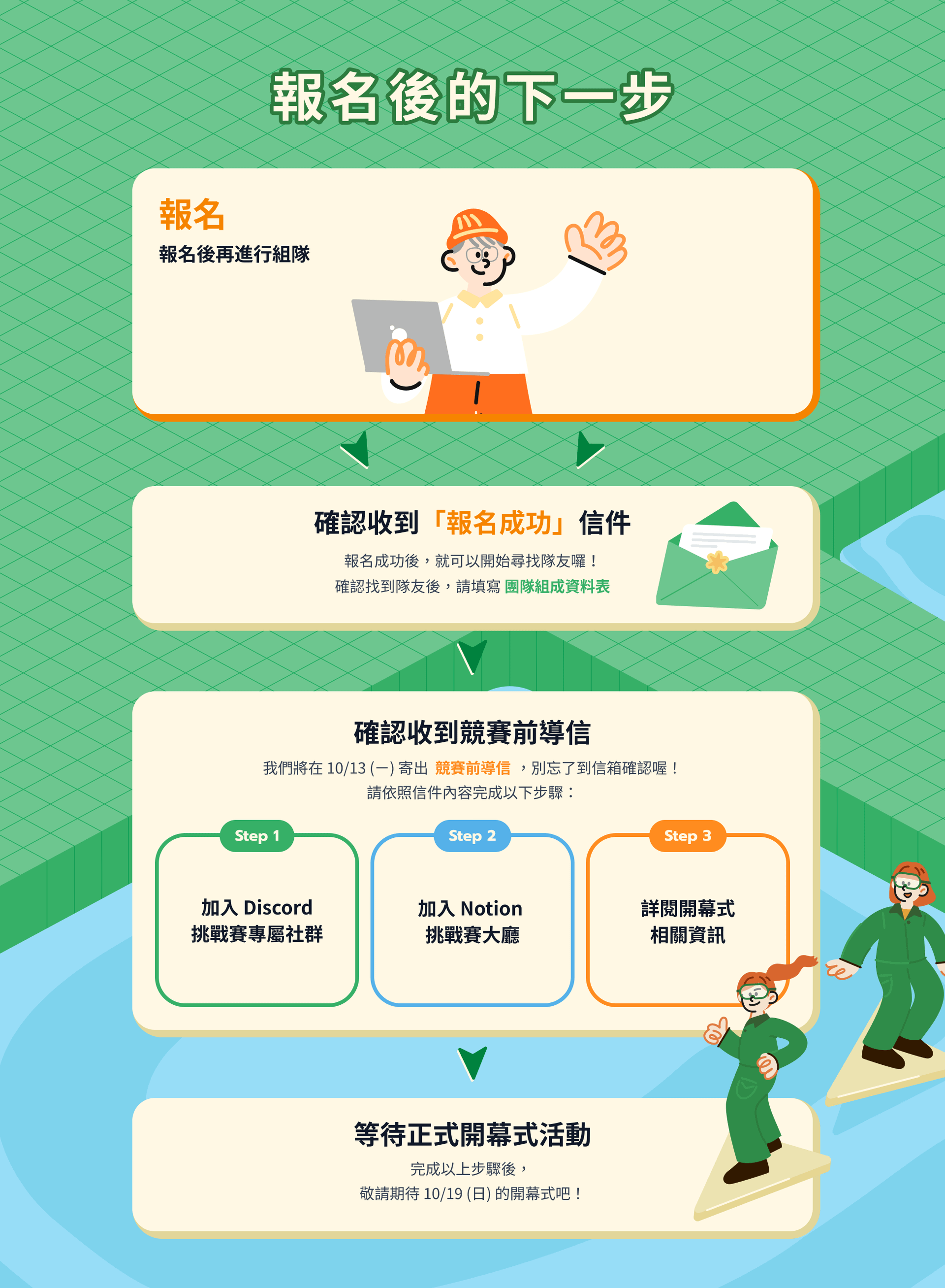 - 10/15 (三) 前若仍未完成組隊, 可以參與當天 19:30 開始的線上媒合會(僅提供給已報名成功的參賽者參與)
