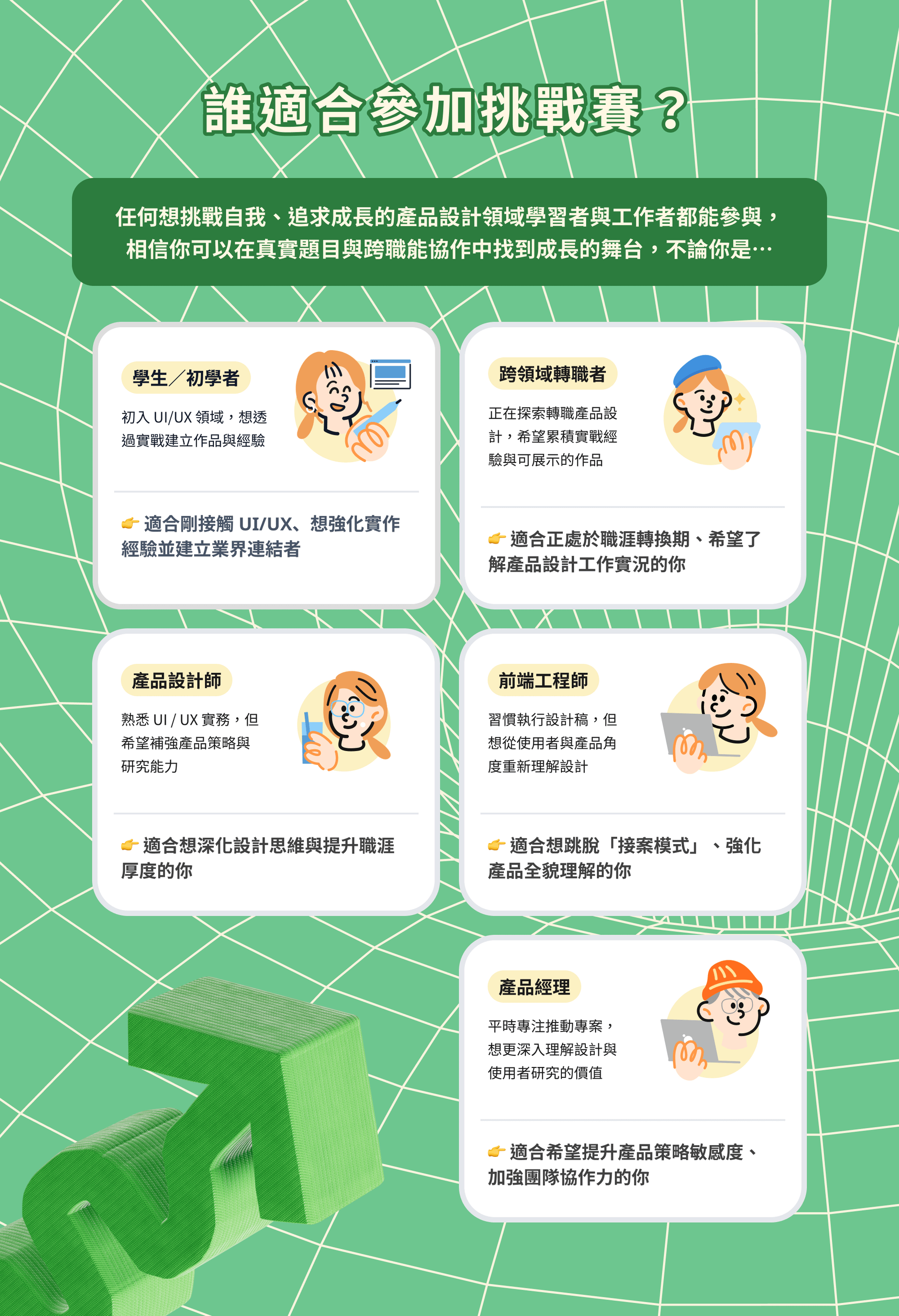 在新一屆挑戰賽的過程中我們規劃了更多學習資源與參賽支持,幫助團隊更有效率地推進專案、收斂設計成果,讓參賽者們能全心專注在設計與協作,發揮跨領域團隊的創意與能量,減少迷失在競賽的流程與零散的資訊溝通中的耗能。