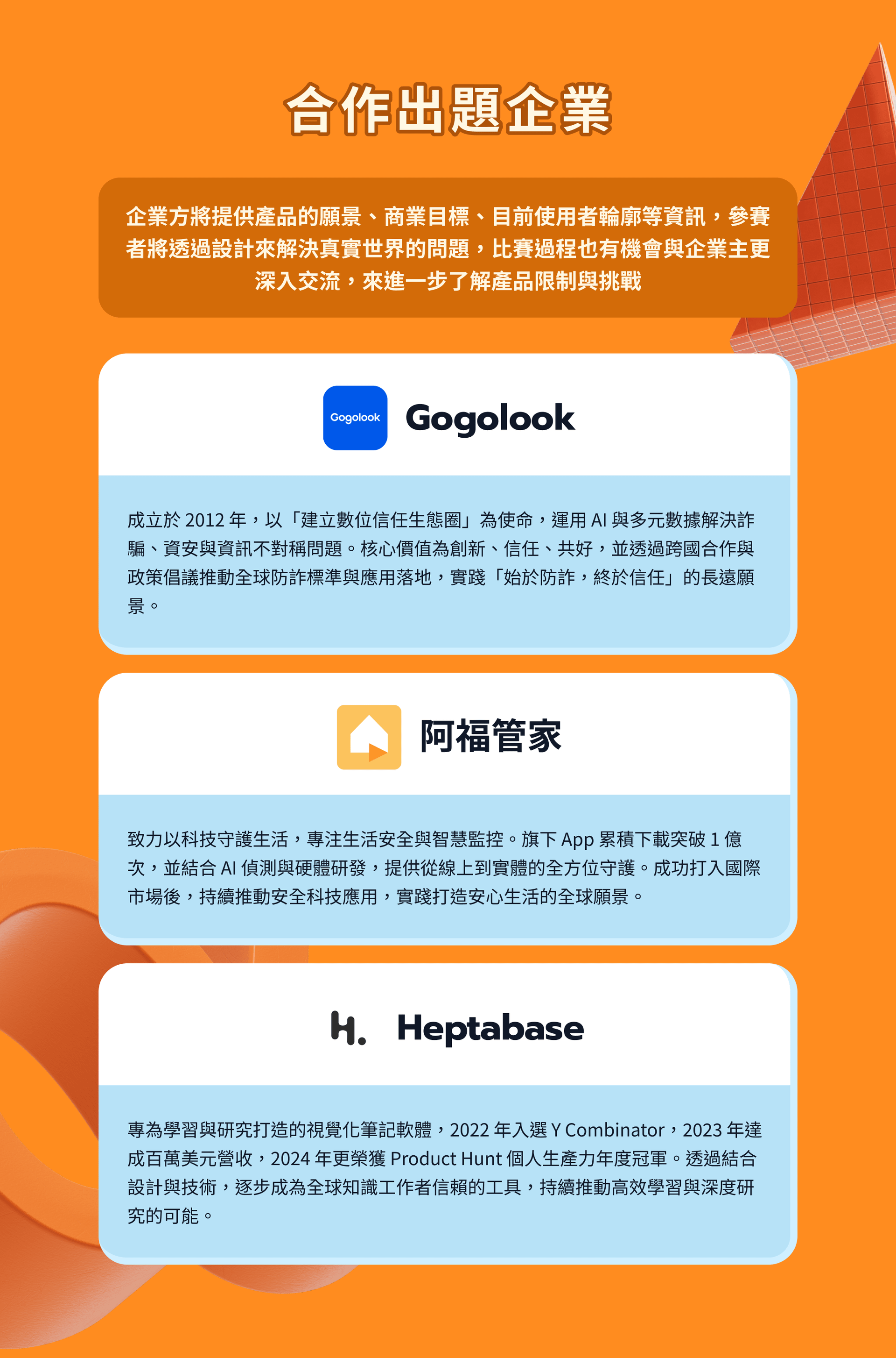在參賽過程中,參賽者們將有機會與以上企業有更深入的交流,例:針對題目內容、產業趨勢、使用者痛點回饋等進行提問,進而提出更具體且可落地的提案。