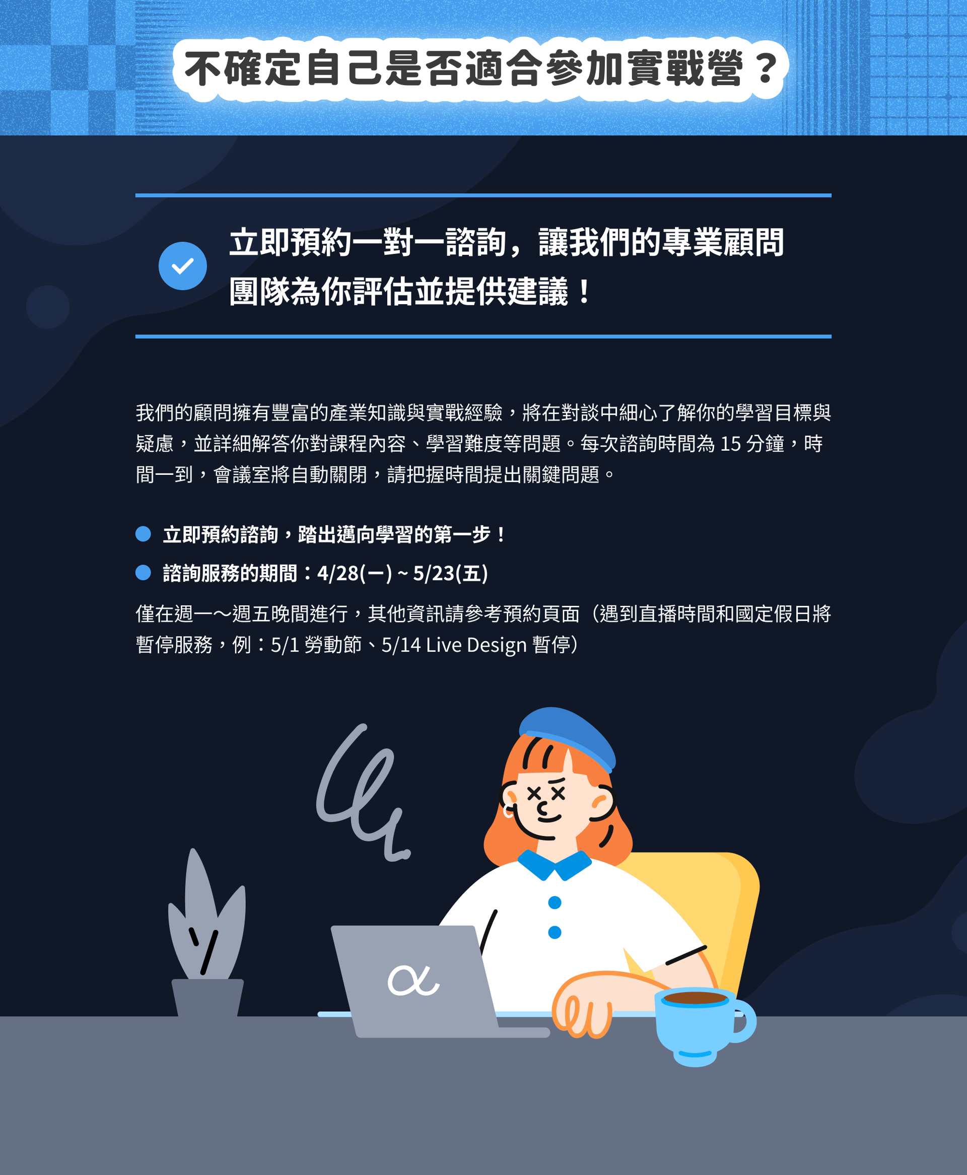 諮詢過程將涵蓋三大核心環節,首先我們會確認您對 AAPD 與實戰營的認識程度,並視需要介紹課程特色;接著深入了解您的具體學習需求、目標及期望獲得的協助;最後和你一起評估可投入的時間與學習資源是否適合這個課程內容。