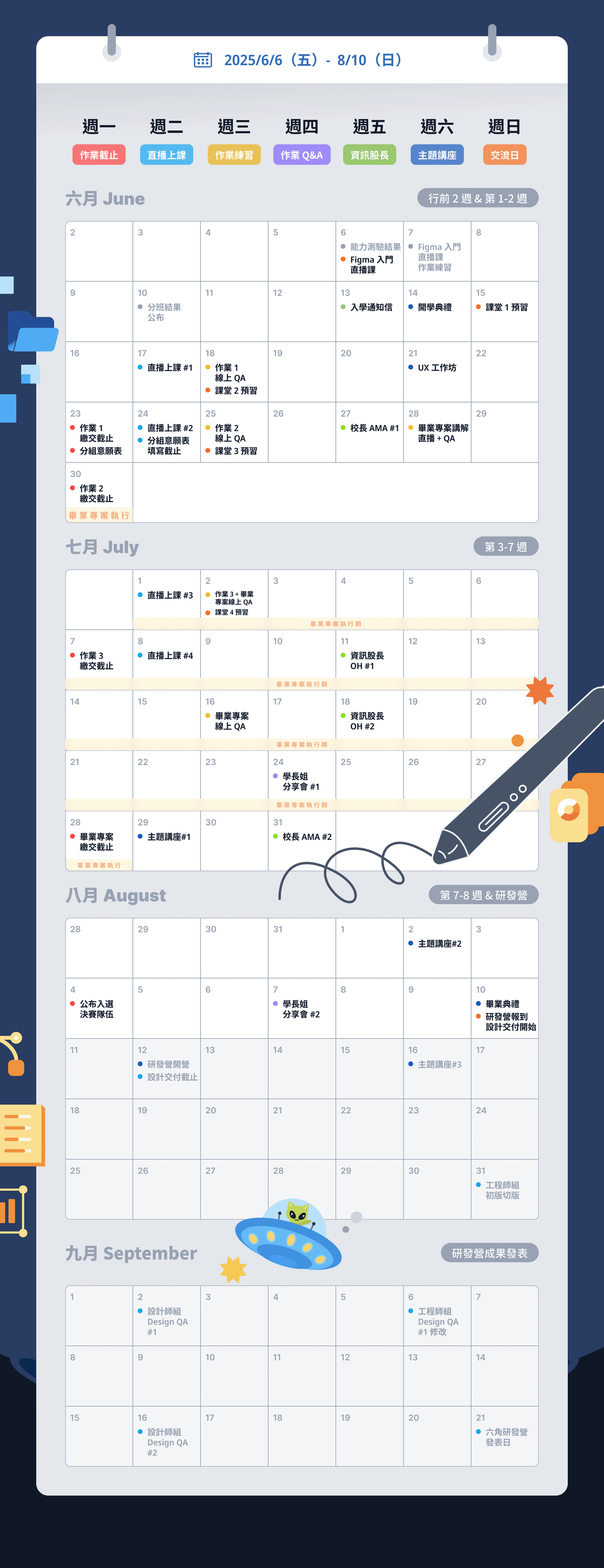 用 10 週 (6/6 - 8/10) 的時間,帶你掌握 AI 時代的 UI/UX 產品設計體驗。營隊期間裡, AAPD 的講師群與專業的助教團隊將陪伴學員們,一起從學習核心基礎知識一路到到進階實作,用 AI 提高效率並幫助你提升 UI 設計能力、明確看見成長曲線!