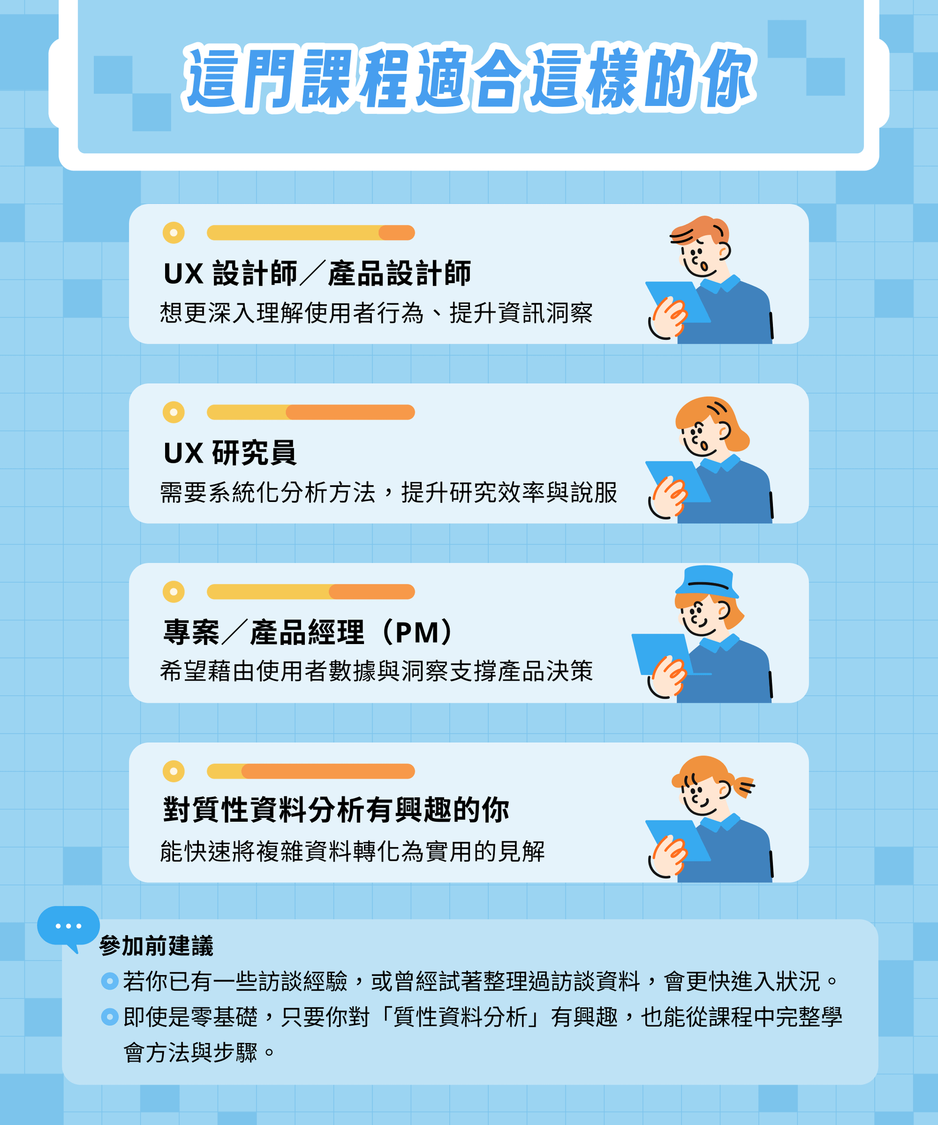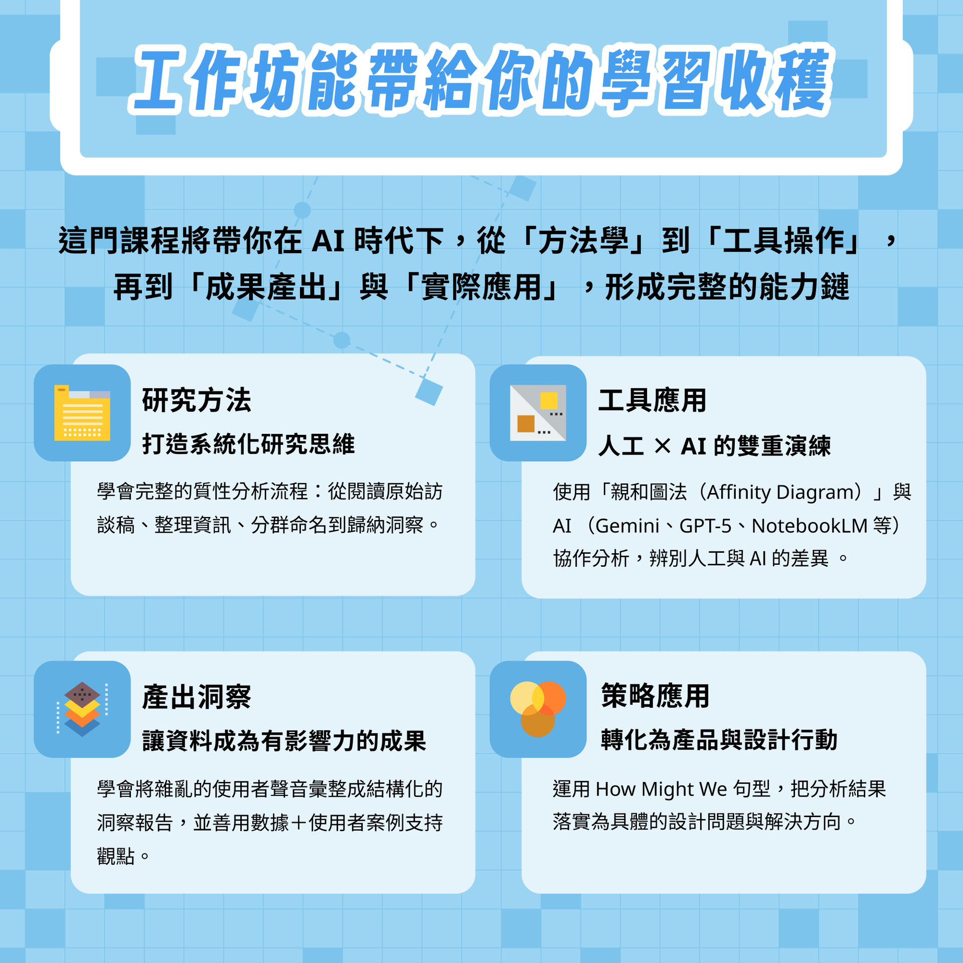 這場實體工作坊將帶你走過從資料整理、分群到歸納結論,幫助你建立系統化的分析的完整流程。同時透過 人工 × AI 的雙重演練,體驗效率與深度兼具的質性資料分析方法,並學會將研究結果轉化為能推動設計與產品決策的有力依據。